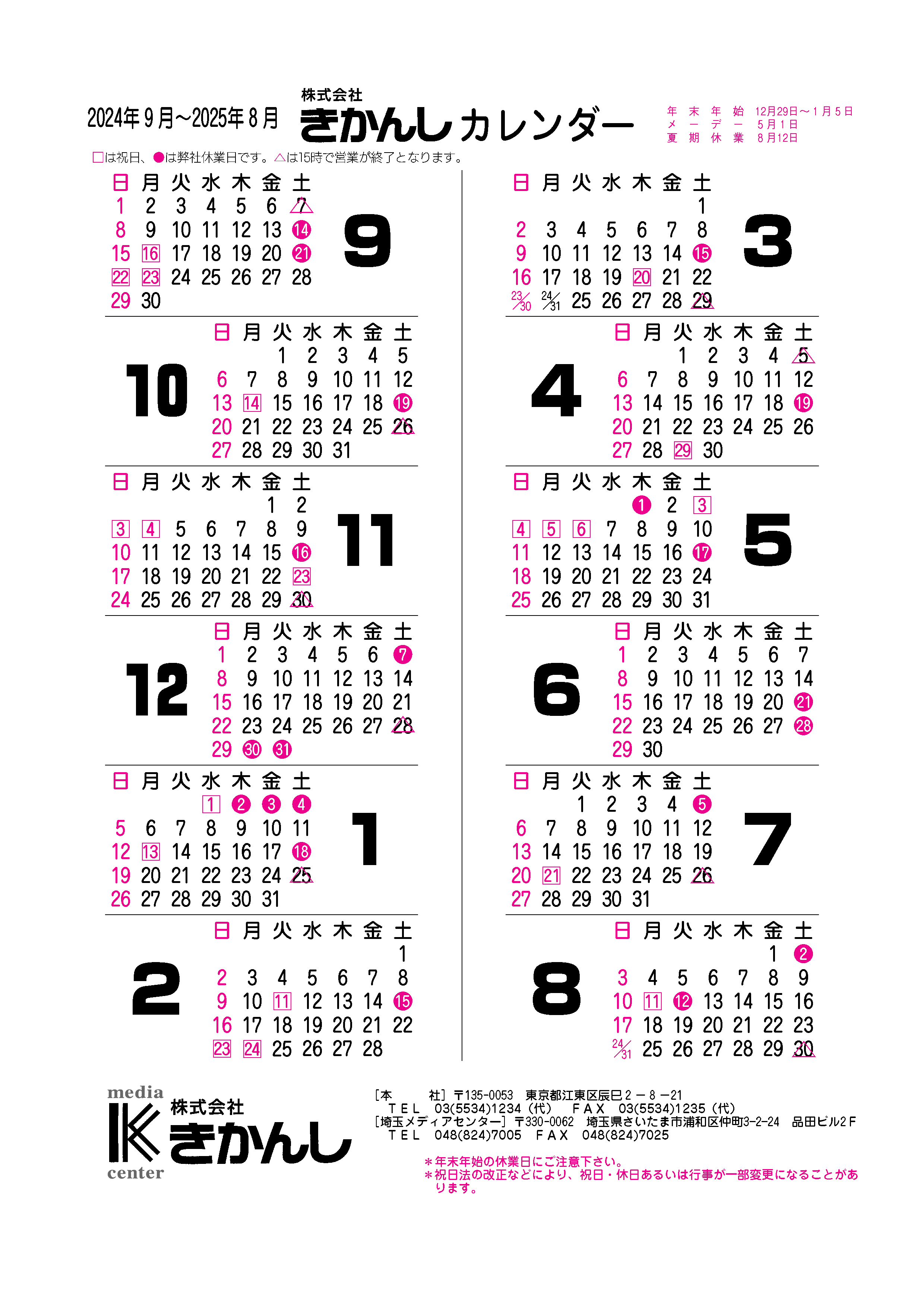 株式会社きかんしの77期(2025年9月~2026年8月)の営業日をお知らせします。