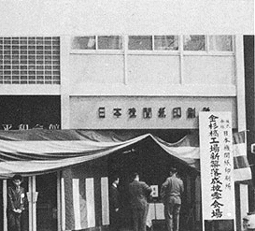 その後、印刷需要が急激に高まり、生産能力の面から仕事を断らざるをえないという状況が続き、その解消策として、1964年に港区金杉橋に鉄筋地上7階建て、地下1階建ての金杉橋工場を新築しました。また、同年に本社の鉄筋コンクリート建替え工事に着手し、第1期工事は65年に完成しました。